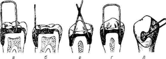 Після закінчення підготовки порожнини під вкладку її очищають від дентинних ошурків, обробляють перекисом водню і розпочинають виготовлення вкладки одним із прийнятих методів, прямим або зворотним. Прямий метод. Суть прямого методу виготовлення вкладки полягає у тому, що зуб з підготовленою порожниною обкладають ватними валиками, а дно та стінки зволожують водою, протираючи їх зволоженою ватною кулькою. Потім беруть паличку моделювального воску " Лавакс", розігрівають кінець її над полум'ям газової горілки до набуття воском пластичної консистенції. Утворюють невеликий восковий конус, і поки віск зберігає пластичність, втискують його руками або шпателем у підготовлену порожнину. Моделювання вкладки проводять з урахуванням анатомічної форми даного зуба та його співвідношень з антагоністами і поруч розміщеними зубами. Отже, після того як віск у порожнині охолонув, його виводять із неї і детально оглядають. Восковий відбиток повинен уводитися та виводитися з порожнини не деформуючись. Після попереднього контролю якості підготовки порожнини починають безпосереднє моделювання вкладки. Підігріту паличку воску знову втискують у порожнину, зайвий віск зрізають, і поки він зберігає пластичність просять пацієнта зімкнути зуби у положенні центральної оклюзії, а вже потім здійснити жувальні рухи. У такому разі зайвий віск звичайно видаляється зубами-антагопістами, а поверхня вкладки набуває форми, характерної для функціональної оклюзії. Таким чином створюється ковзка оклюзія без попередніх контактів. Наступне моделювання повинно бути спрямоване насамперед на відновлення анатомічної норми зруйнованої частини зуба. Край воскової моделі повинен дещо перекривати край порожнини. Такий запас воску дозволяє запобігти вкороченню вкладки у процесі лиття та припасовки. У разі виготовлення вкладки у пришийковій порожнині її необхідно моделювати на одному рівні з прилеглими твердими тканинами зуба. Для виведення готової воскової репродукції вкладки беруть металевий дріт товщиною 0, 8-1, 0 мм і виготовляють з нього штифти (мал.43). Якщо вкладка невелика, її можна вивести одним штифтом із загнутим зовнішнім кінцем. Якщо вкладка велика, її виводять за допомогою штифта з двома кінцями, що мають 11-подібну форму. Кінці штифта, які уводять у віск, необхідно очистити. Потім штифт міцно фіксують за допомогою пінцета, кінці його підігрівають над полум'ям горілки і вводять у модель вкладки. Руку фіксують на поруч розмішених зубах, щоб запобігти коливанням. Після затвердіння воску штифт служить ручкою, за допомогою якої вкладку без коливань виводять з ротової порожнини і передають у ливарну лабораторію для заміни воску на метал. Зворотний спосіб виготовлення вкладок полягає у тому, то воскову репродукцію вкладки моделюють не в ротовій порожнині, а на попередньо виготовленій за комбінованим або подвійним відбитком моделі. Необхідно зазначити, що широко застосовуваний у 50-60 роки XX ст. метод отримання відбитка за допомогою мідного кільця нині не застосовується через свою складність, недосконалість та можливість ускладнень з боку тканин пародонта. Нині широкого застосування набули методи отримання подвійних відбитків з наступним виготовленням розбірних моделей. Після виготовлення розбірних моделей починають моделювання вкладки з ураху
