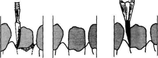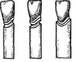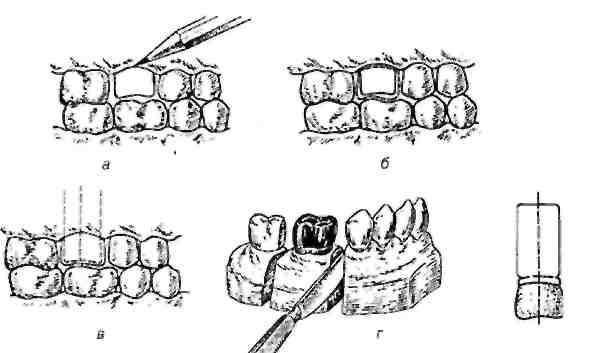 Мал. 49. Виготовлення гіпсового штампа: а — позначення шийки зуба олівцем; б —