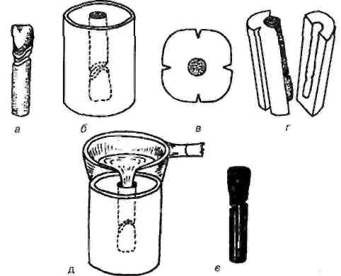 Мал. 51. Виготовлення металевого штампа: а - гіпсовий штамп; б – гіпсовий штамп. У гумовому кільці; в — гіпсовий блок разом з гіпсовим штампом; г - розколотий гіпсовий блок; д — заповнення гіпсового блока (форми) легкоплавким металом; в - металевий штамп.