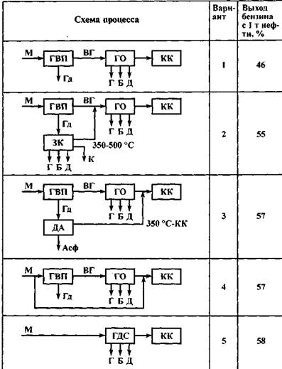Рис. 1. Пять вариантов схем получения сырья для каталитического крекинга: ГВП - глубокая вакуумная перегонка; ГО - гидроочистка; КК - каталитический крекинг; ЗК - замедленное коксование; ДА - деасфальтизация; ГДС - гидродесульфаризация; потоки: М — мазут; ВГ - вакуумный газойль; К - кокс; Асф - асфальтены; Гд - гудрон; Г - газ; Б - бензин; Д - дизельное топливо.