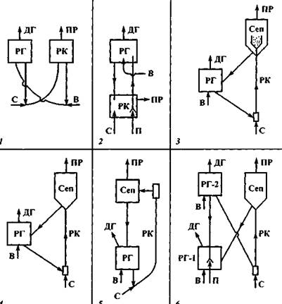 Рис. 2. Варианты схем реакторно-регенераторных блоков различных систем каталитического крекинга: / - модель III; 2 - модель V; 3 - модель Г-43-107; 4 - модель «UOP» (Г-43-107А); 5 - система фирмы " Келлог"; 6 - система фирмы «Тотал»; РК - реактор; РГ - регенератор; Сеп - сепаратор; С - сырье; ПР - продукты реакции; ДГ - дымовые газы; В - воздух; П - водяной пар; Жирными линиями показано движение катализатора.