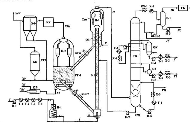 Р-1 - реактор сквознопоточный; РГ-1 - регенератор с кипящим слоем; Сеп - сепарационная зона реактора; Ц-1, -2 - циклонные группы; КУ -котел-утилизатор; ЭФ - электрофильтр; БК - бункер для катализатора; ПВ - подогреватель воздуха; П-1 - трубчатая печь; РК -ректификационная колонна; ОК - отпарная колонна; ГБ - газовый блок; ОЗ - отпарная зона; остальные обозначения - см. рис. 4.9; Потоки: /- сырье; // - продукты реакции; /// - углеводородный газ; IV - бензин; V - керосиновая фракция; VI - сырье для технического углерода (фракция 350-420 °С); VII - остаточная фракция выше 420 °С; VIII - шлам; IX - водный конденсат; X - перегретый водяной пар; XI -воздушное дутье; XII- топливо на нагрев воздуха; XIII- дымовые газы; XIV- очищенные и охлажденные дымовые газы; XV- свежий катализатор на догрузку системы; XVI- уловленная катализаторная пыль; XVII- закоксованный катализатор; XVIII - регенерированный катализатор.