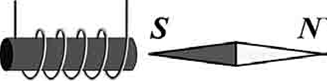 4. (2 бали) Між полюсами сильного електромагніту швидко обертають кільце, зроблене з мідного дроту. При цьому кільце нагрівається. Чому? 5. (3 бали) Укажіть напрямок електричного струму в котушці.