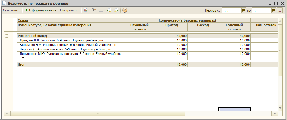 Сформируем отчет по остаткам на Розничном складе 12.1. Пункт меню: Отчеты > Запасы (склад) > Ведомость по товарам в рознице