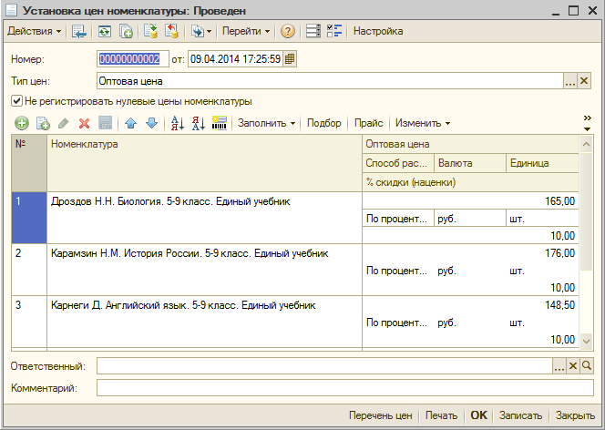 16.1. Для начала установите оптовые цены номенклатуры. 16.1.1. Пункт меню: Документы > Ценообразование > Установки цен номенклатуры. 16.1.2. Заполните табличную часть методом «Заполнить по поступлению» (выберите соответствующее поступление).