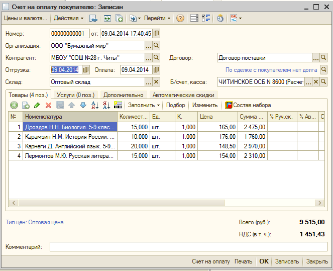 16.8. На основе реализации товаров и услуг выставите Счет на оплату.