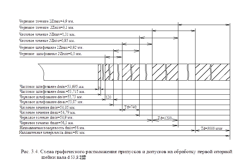 где Т-(ТD или Тd) точность выполнения размера заготовки (наращенной поверхности). Для последующих переходов, операций погрешность пространственных отклонений может быть определена, если принять условие, что каждая после дующая операция снижает величину погрешности на 90% (т.е Тi=0.1Тi-1 ).