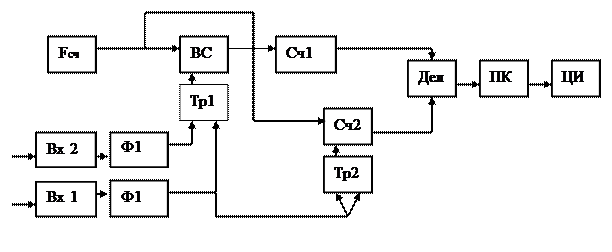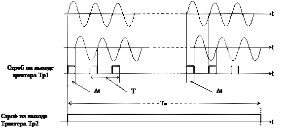 На рисунке 7.9 и 7.10. обозначено: Fсч – генератор импульсов (счетных) частота которых Fсч; Вх 1 и Вх2 – входные устройства, на вход которых подаются синусоидальные сигналы, сдвиг фаз между которыми нужно измерить; Ф1 и Ф2 – формирователи, которые формируют короткие импульсы в момент перехода через нулевой уровень синусоидального сигнала; Тр1 и Тр2 – времязадающие триггеры. На выходе Тр1 формируется строб, длительности Δ t, а на Тр2 длительностью Т. ВС – временной селектор, на выход которого будут проходить счетные импульсы, пока на его втором входе присутствует строб; Сч1 и Сч2 – двоичные счетчики, подсчитывающие (в двоичном коде) поступившие на вход счетные импульсы. Счетчик Сч2 подсчитывает импульсы только за время разрешающего строба с Тр2, длительность которого равна периоду измеряемого напряжения. Дел – делитель, на выходе которого образуется частное от деления числа, полученного на первом счетчике (n), на число второго счетчика (N). Здесь же осуществляется умножение частного от деления на 360 (или 2π); ПК – преобразователь двоичного кода в десятичный, который отображается на цифровом индикаторе (ЦИ). На выходе первого счетчика будет число