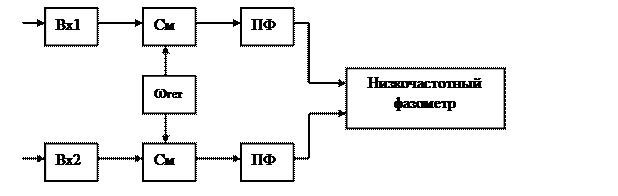Рис. 7.14. Здесь ω гет – генератор синусоидальной частоты, ПФ – полосовые фильтры, пропускающие разностную частоту ω 1- ω гет., СМ – смесители. Запишем основные соотношения для этой схемы. На входном устройстве Вх1: u1(t)=sin(ω t+φ 1) На втором входном устройстве: u2(t)=sin(ω t+φ 2) На вход низкочастотного фазометра поступают колебания: