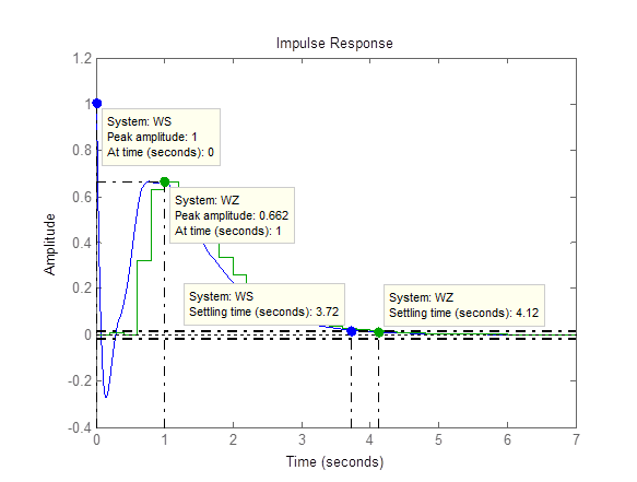 Рисунок 5 – Графики переходных процессов модели WS и WZ На графиках переходных процессов ступенчатой линией представлен переходной процесс дискретной модели, а сплошной линией – непрерывной модели. Кроме того, в поле графика указаны основные характеристики переходного процесса: • время нарастания переходного процесса (Rise time) – 1, 76 с для обоих моделей; • время регулирования (Setting time) – 2, 9 для непрерывной модели и 2, 89 с для дискретной модели; • установившееся значение выходной координаты (Final value) – 0, 923 для обоих моделей.