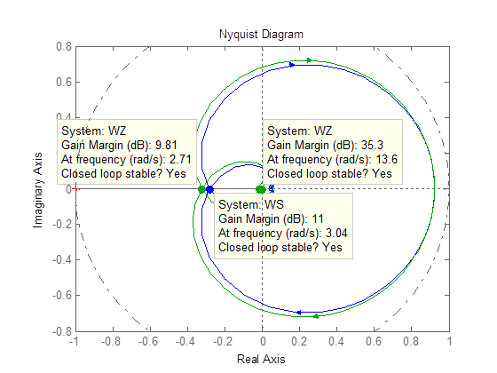 Анализ частотных характеристик показывает, что модели WZ и WS являются устойчивыми с соответствующими запасами устойчивости по амплитуде. Запас устойчивости по фазе равен бесконечности. Этот вывод подтверждается так же комплексной амплитудно-фазовой характеристикой АФХ, которая в зарубежной литературе называется диаграммой Найквиста, так как годограф АФХ не пресекает точку комплексной плоскости с координатами –1, j0.
