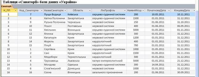 4. 5. Створити й заповнити таблицю «Санаторії» з використанням Майстра підстановок (використати дані таблиці Області1). 6. Імена полів таблиці « Санаторії»: Н_ПП –лічильник, КодСанаторію –числовий, НазваСанаторію -текстовий, Область –текстовий, ЛікПрофіль –поле МЕМО, НаявнМісць –числовий, ПочДата і КінцДата –Дата і час). 7. Додати до бази даних таблиці Заповідники, Номери машин та Сусіди імпортувавши їх з MS Excel та Access з папки вказаної викладачем