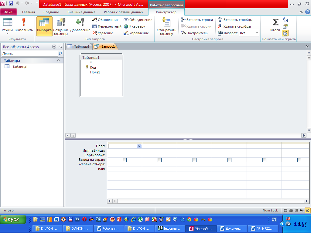 Тема: Система управління базами даних MS Access. Створення зв'язків між таблицями. Створення простих запитів. Створення обчислювального поля. Мета: засвоїти навички редагування таблиць БД, ознайомитися з командами СУБД Access для налагодження зв'язків між таблицями, засвоїти алгоритми роботи з об'єктом запит, навчитись створювати прості запити. Контрольні запитання: 1. Що таке «ключове поле» таблиці БД? Чому таблиці БД повинні мати ключові поля? 2. Як встановити ключ таблиці? 3. Для чого полям таблиці надають статусу ключового? 4. Правила надання полям статусу ключового. 5. Як відмінити ключ? Чи завжди це можна зробити? 6. Яким вікном користуються для встановлення зв'язку між таблицями? 7. Які існують типи зв'язків між таблицями? 8. Які є запити? 9. Які існують типи запитів 10. Чим запит відрізняються від фільтра? 11. Як зберігають запити? 12. Що означає термін «групові дії»? 13. Як виконати запит? ПОРЯДОК ВИКОНАННЯ РОБОТИ: 1. Відкрити файл бази даних Україна_Ваше_прізвище. 2. 3. Визначте ключовим полем поле Область у таблиці Номери машин. 4. Змініть структуру таблиці Санаторії в режимі Конструктора. Виберіть поля: Ø Н_ПП (тип - лічильник) Ø Область (тип - текстовий); 5. Зробіть поле Область ключовим – складний ключ: виділити обидва поля, утримуючи клавішу CTRL та натисніть кнопку; Чому в даній таблиці не можна зробити поле Область ключовим? 6. Відкрийте таблицю Заповідники та зробіть поле Назва та поле Область ключовими; 7. 8. У вікні “ Добавление таблицы ” вибирати послідовно таблицю ” та натиснути кнопку “Добавить”. Захопивши ЛКМ відповідне поле однієї таблиці перетягуємо до відповідного поля іншої таблиці 8. 9. У вікні Схеми даних центральною розмістіть таблицю Області1 та за полями Область створіть зв'язки між таблицями Області1, Санаторії, Заповідники, Номери машин - зверніть увагу на тип зв'язку між таблицями - які з'явились типи зв'язку? 10. Додати до бази даних таблицю Сусіди імпортувавши її з MS Access з папки вказаної викладачем 11. 12. Перевірте створені зв'язки за зразком. 13. Збережіть схему даних зі створеними зв'язками. 14. Сконструюйте і виконайте запит Області_Ч на вибірку всіх областей із таблиці Області1, назви яких починаються на літеру Ч: виберіть піктограму Конструктор запросов із групи Запросы, в діалоговому вікні Добавление таблицы виберіть таблицю Області1, кнопка Добавить, кнопка Закрыть, у вікні конструктора, виберіть всі поля, задайте умову вибірки: під полем Назва області в рядку Условие отбора введіть умову Ч*
