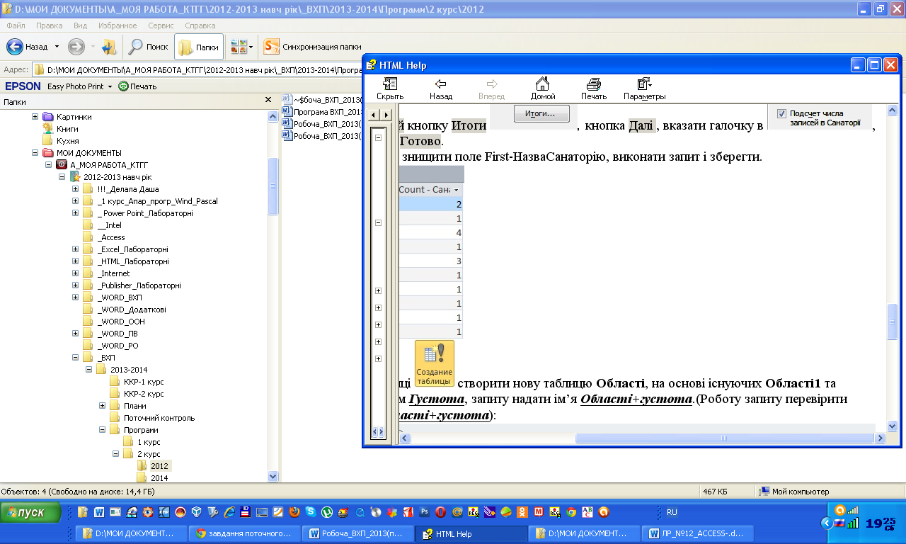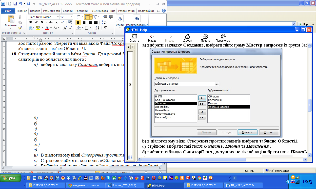 15. 16. В результаті відібрані записи з назвами областей, що починаються на літеру Ч. 17. Збережіть запит з ім’ям Області_Ч, активізувавши ПКМ контестне меню ярлика заголовку запиту або піктограмою Зберегти чи вказівкою Файл/Сохранить. Переконайтесь, що в списку запитів з'явився запит з ім’ям Області_Ч. 18. Створити простий запит з ім'ям Запит_Гр в режимі Майстра запитів для підрахунку кількості санаторіїв по областях для цього: а) виберіть закладку Создание, виберіть піктограму Мастер запросов із групи Запросы