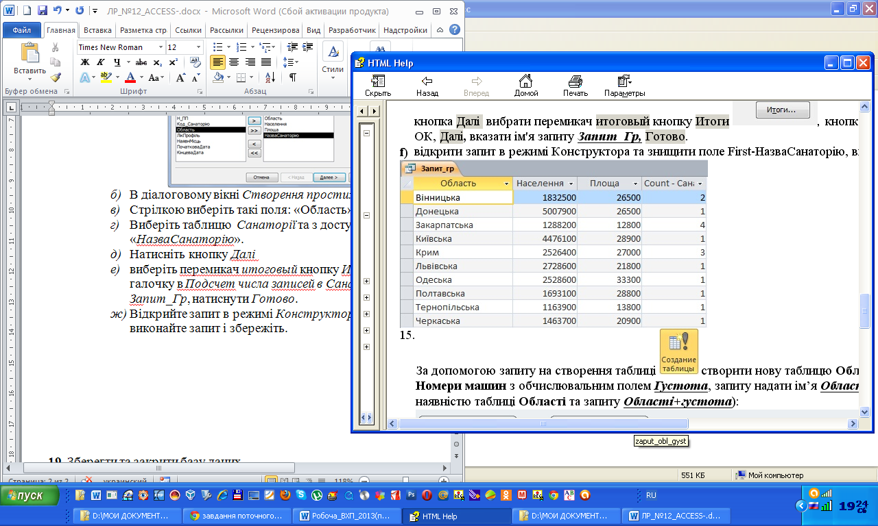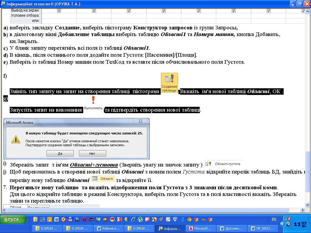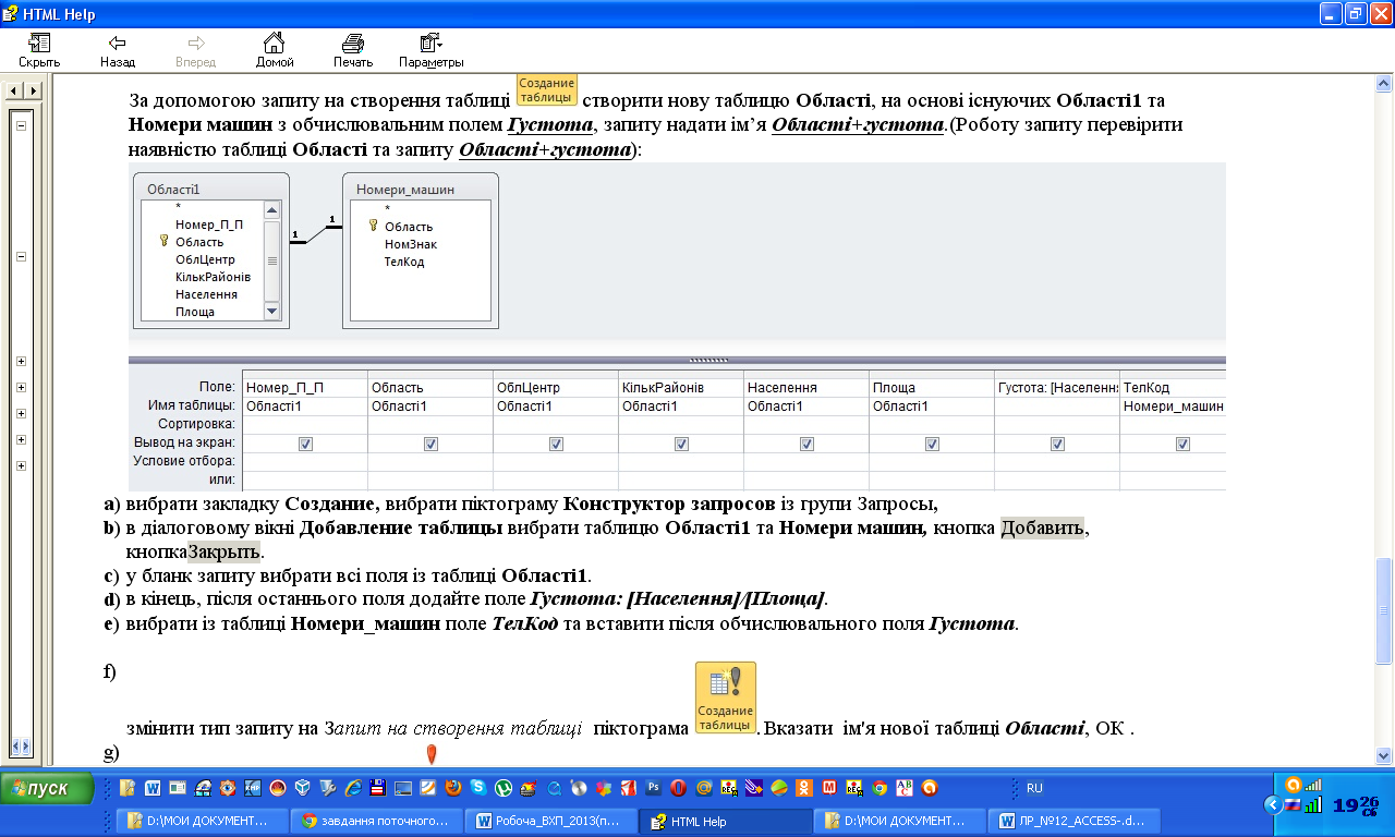 а) вибрати закладку Создание, вибрати піктограму Конструктор запросов із групи Запросы, б) в діалоговому вікні Добавление таблицы вибрати таблицю Області1 та Номери машин, кнопка Добавить, кнопка Закрыть. в) у бланк запиту вибрати всі поля із таблиці Області1. г) в кінець, після останнього поля додайте поле Густота: [Населення]/[Площа]. д) е) змінити тип запиту на Запит на створення таблиці піктограма