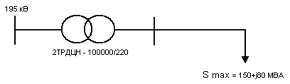 Для выбора рациональной отпайки следует учесть падение напряжения в сопротивлении трансформатора и потери мощности, то есть расчет сводится к итерационному процессу, так как задано напряжение в питающем узле 1 и нагрузка потребителя в узле 2. Для упрощения расчета пренебрежем потерями мощности в трансформаторе, тогда