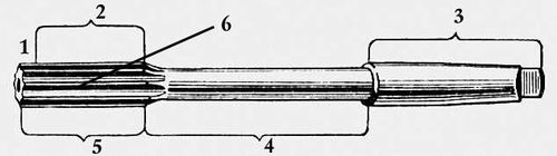 Рис. 4. Формы заточки сверла по металлу: • одинарная или нормальная; • одинарная с подточкой поперечной кромки; • одинарная с подточкой поперечной кромки и ленточки; • двойная с подточкой поперечной кромки; • двойная с подточкой поперечной кромки и ленточки. Развертка Развёртка -многолезвийный металлорежущий инструмент, предназначенный для точной и чистовой обработки (развёртывания) отверстий после их предварительной обработки сверлом, зенкером или расточным резцом. Развертки могут быть машинными (применяются на станках) и ручными (применяются при слесарных работах). Развертки различают: по форме развёртываемого отверстия - цилиндрические, конические и ступенчатые; по форме зубьев - с прямыми и винтовыми зубьями; по способу закрепления - вставные (с хвостовиком) и насадные (с отверстием); по конструкции - цельные, составные (сборные), напайные, с механическим или клеевым закреплением зубьев (ножей), разжимные и плавающие. Рабочая часть развертки состоит из режущих и калибрующих зубьев. Режущие зубья остро затачивают, на калибрующих оставляют ленточку шириной 0, 1-0, 3 мм. Конец калибрующей части выполняется с обратным конусом по направлению к хвостовику для уменьшения трения развертки о стенки отверстия.