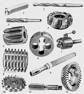 Станочный металлорежущий инструмент: 1 - с механическим креплением пластинки твёрдого сплава; 2 - винтовое сверло; 3 - зенкер с коническим хвостовиком, оснащенный твердосплавными пластинками; 4 - торцевая насадная фреза со вставными ножами, оснащенными твёрдым сплавом; 5 - машинная развёртка с твердосплавными пластинками; 6 - плашка; 7 - винторезная головка с круглыми гребёнками; 8 - червячная фреза; 9 - шлицевая протяжка; 10- резцовая головка для обработки конических колёс с круговым зубом; 11- метчик; 12- зуборезный долбяк со спиральными зубьями.