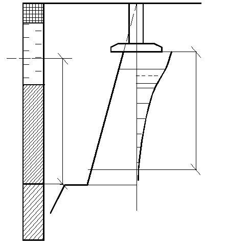В виде, разрешенном относительно Е, формула (3.8) используется для полевого определения модуля деформации штампом. Значения коэффициента Пуасона ν в (3.8) при отсутствии экспериментальных данных допускается принять по виду грунта в пределах: – глины и суглинки nолутвердые и твердые ν = 0, 1…0, 15; – то же, тугопластичные - 0, 2…0, 25; – мягкопластичные и текучепластичные- 0, 3…0, 4; – текучие - 0, 45…0, 5; пески и супеси - 0, 15…0, 30. Реальные основания обычно слоистые, сжимаемость отдельных слоев различная и для расчета осадки чаще всего применяется метод послойного суммирования. Для большей наглядности рассматриваем применение метода в графоаналитической форме. Расчеты и сопровождающие их построения проводятся в следующем порядке: 1) Вычерчивается схема фундамента и геологического строения основания. 2) Строится эпюра природного давления σ zg и ее ординаты в масштабе откладываются влево от z. В водоносном слое ниже WL учитывается взвешивание грунта в воде, а на кровле водоупора – скачок давления - γ ω нω . 3) Толща грунта под подошвой фундамента разбивается на расчетные слои h i =0, 4b, где b – ширина подошвы фундамента. 4) По (3.9) определяется начальное уплотняющее давление Р0. 5) Определяется значение уплотняющего давления под центром (средней точкой) подошвы фундамента на границе каждого расчетного слоя: σ zpi = α i· P0. (3.10) Значения Эпюра 6) Определяется нижняя граница сжимаемой толщи основания. Критерием ее установления в СНиП принято условие: