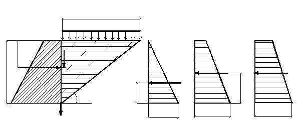 Пусть на поверхности засыпки действует равномерно распределенная нагрузка q. В этом случае эпюра активного давления трапецеидальная и равнодействующая или площадь эпюры (рис. 4.9, б) равна: