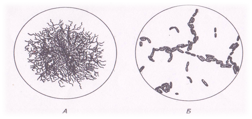 Рисунок 9. Грибоподібна бацила Bacillus mycoides. А – колонія на МПА; Б – клітини молодої культури під мікроскопом. Вивчення фізіолого-біохімічних ознак мікроорганізмів. включає дослідження ферментної активності мікробів, відношення їх до різних джерел вуглецю і азоту, характер продуктів життєдіяльності, які нагромаджуються в поживних середовищах (гази, кислоти, спирти тощо), а також реагування бактерій на кисень, кислоти, луги та інші фактори довкілля.Ферментну активність виділеної культури визначають за розрідженням желатину при уколі в стовпчик желатину, а також за коагуляцією і пептонізацією молока. Визначають активність амілази, целюлози, сахарози, уреази, нітратредуктази тощо. У актиноміцетів визначають утворення ними антибіотиків.Щоб встановити, які джерела використовуються досліджуваною культурою, виготовляють спеціальне синтетичне поживне середовище і до нього додають 1% вуглецевої сполуки (яку хочуть випробувати). Найчастіше з цією метою застосовують пентози, гексози, дисахариди, полісахариди, солі органічних сполук, спирти, жири тощо. Для вивчення використання мікроорганізмами джерел азоту в основному мінеральному середовищі замінюють фосфат амонію на фосфат калію, додають 1% глюкози, а як джерело азоту використовують альбумін, пептон, амінокислоти, сечовину, аміачні й нітратні солі. Щоб виявити здатність мікроорганізмів засвоювати молекулярний азот, із поживного середовища виключають всі зв’язані форми азоту. Відношення до кисню виявляють за допомогою посіву культури методом уколу в пробірки з МПА, МПЖ та ін. Аероби, як правило, розвиваються у верхній частині середовища. Факультативні анаероби – майже по всьому сліду уколу, облігатні анаероби – тільки в нижній частині. Щоб виявити витривалість мікроорганізмів до кислот та лугів, до поживного середовища додають різні буферні суміші (для підтримання певного pH середовища). При використанні мікробами сполук вуглецю (вуглеводів) у субстраті як продукти життєдіяльності можуть нагромаджуватись органічні кислоти, спирти, гази тощо, які можна виявити за допомогою різних методів (використанням індикаторів, якісних хімічних реакцій тощо). Стійкість бактерій до температури найчастіше виявляють при вирощуванні їх у полі термостатах з різною температурою. Стійкість до концентрації солей у середовищі – культивуванням на основних поживних середовищах з добавкою різних концентрацій солей NaCl, Na2SO4.