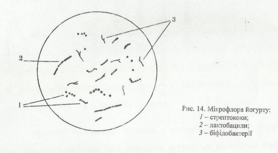 Рисунок 13. Мікрофлора йогурту: 1- стрептококи; 2 – лактобацили; 3 – біфідобактерії.