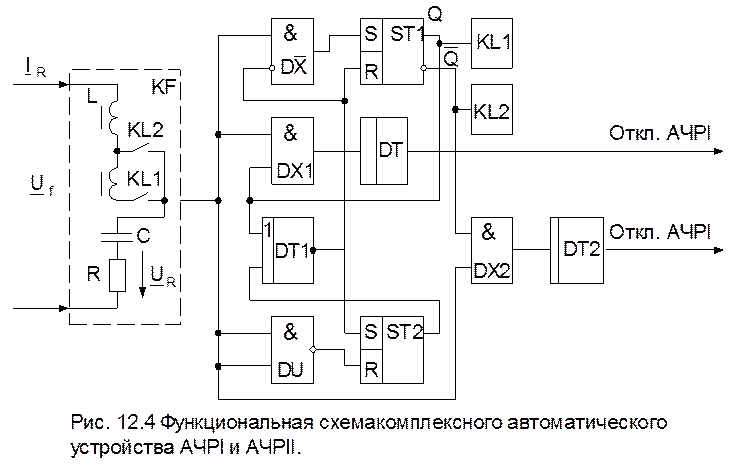 На рис. 12.4 приведена функциональная схема известного релейно-контактного совмещенного автомата АЧРI и АЧРII с одним минимальным измерительным реле частоты KF. В нормальном режиме работы реле KF настроено на установленную частоту срабатывания АЧРII, равную, как указывалось, fуII = 49, 2 Гц: сигналом логической единицы с инверсного выхода Q= 1 статического триггера ST1 возбуждено герконовое реле KL2, его контакт в цепи реактора L резонансного контура реле KF замкнут. В утяжеленном режиме после снижения частоты до f = fyII реле KF срабатывает и дискретным выходным сигналом (логической единицей), проходящей через элемент DX (ЗАПРЕТ), поскольку на его нижнем инверсном входе логический нуль, переводит триггер ST1в состояние запоминания срабатывания реле KF.Логической единицей на прямом выходе Q = 1 триггер возбуждает герконовое реле KL1, a логическим нулем инверсного выхода Q = 0 обесточивает обмотку геркона KL2. замыкающим контактом геркон KL1 дискретно увеличивает индуктивность реактора L и тем самым уменьшает установленную частоту срабатывания реле KF до, например, fyI1 = 48, 5 Гц. Реле частоты возвращается. Триггер ST1 логической единицей Q = 1 запускает элемент времени DT1 с установленным временем разрешения действия автомата АЧРI и единицей на нижнем входе элемента DX1 (И) подготавливает цепь его действия на отключение. Если частота успевает снизиться до f = fyII за указанное время, то реле частоты KF, срабатывая, через элемент DX1 и элемент DT небольшой задержки (tз < 0, 1 с) производит отключение потребителей электроэнергии, относящихся к AЧРI. Если же частота не снижается до указанной, элемент времениDT1 логической единицей, поступающей на вход считывания R триггера ST1, возвращает его в исходное состояние, вновь возбуждается геркон КL2, а обмотка геркона KL1обесточивается. При этом по цепи положительной обратной связи, реализуемой триггером ST2, после поступления на его вход записи S логической единицы элемент DT1 по входу ИЛИ самоудерживается в состоянии после срабатывания, запрещая через инверсный вход элемента DX воздействие на триггер срабатывающего, вследствие восстановления переключающими контактами KL1, KL2 (снова замыкается KL2) частоты срабатывания до fyII реле частоты KF. Измерительные реле частоты через элемент DX2 (И), на верхнем входе которого единица Q = 1 с инверсного выхода ST1, запускает элемент времени DT2 действия на отключение автомата АЧРII; логическим нулем Q = 0 на прямом выходе ST1, поступающим на нижний вход DX1, не разрешается прохождение сигнала от реле KF в цепь отключения АЧРI. Если за относительно большое время действия DT2 (не менее 5 с), частота восстанавливается до f > fyII, то измерительное реле частоты возвращается и логическим нулем на нижнем входе DX2, а через инвертор DU логической единицей на входе считывания R триггера ST2 возвращает элементы времени DT2 и DTI в исходное состояние. Триггер DT1 выдает логическую единицу на инверсном выходе Q = 1, т.е. удерживает возбужденным геркон KL2 и установленную частоту срабатывания реле KF равной fyII, что и должно быть в нормальном режиме работы при нормальной частоте. Аналогично функционирует и известное релейно-контактное устройство с одним измерительным реле частоты, выполняющее функции автоматов АЧР и ЧАПВ.