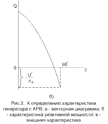 Этому выражению соответствует кривая, изображенная на рис.2, б. Увеличение угла δ (рис.2, а) вызовет уменьшение реактивной мощности, а следовательно, поворот вектора тока IC в сторону уменьшения угла φ. Новое положение вектора тока показано на диаграмме пунктирной линией (предполагая, что мощность Q изменила знак и ток стал опережать напряжение U). Этому току соответствует новое положение вектора ЭДС Е, показанное также пунктирной линией. Новое значение напряжения на шинах генератора найдем, поделив падение напряжения в сопротивлении xd∑ в той же пропорции, как и в предыдущем случае. Из диаграммы следует, что увеличение угла δ вызывает уменьшение напряжения на шинах генератора. Предположим, что генератор снабжен автоматическим регулятором возбуждения, который контролирует напряжение UG. Значение же ЭДС Е до тех пор, пока не восстановит прежнее значение напряжения. Рассматривая установившиеся режимы работы генератора с АРВ при различных значениях угла δ, часто исходят из постоянства напряжения UG. Значение же ЭДС генератора при этом будет возрастать с увеличением угла δ. На рис.2, в. показано семейство характеристик Р=f(δ), построенных для различных значений ЭДС. Если принять за исходную точку нормального режима точку а, то при увеличении мощности Р0 (сопровождающемся увеличением угла δ) точки новых установившихся режимов будут определяться переходом с одной характеристики на другую в соответствии с секторной диаграммой (рис.2, а). Соединив м/у собой точки установившихся режимов при разных уровнях возбуждения, получим внешнюю характеристику генератора. Она возрастает даже в области углов δ > 900, и ее максимум достигается при угле δ G=900, где δ G – угол вектора напряжения на шинах генератора UG. Но возможность работы в области углов больше 900 зависит от типа регулятора возбуждения. Регуляторы пропорционального типа (РТП) при коэффициентах усиления (коэффициент усиления определяется как соотношение чисел единиц возбуждения и единиц напряжения генератора) К0у =50..100 позволяют поддерживать напряжение на шинах генератора почти постоянным (∆ UG ≈ 0). Но предельная мощность генератора, снабженного АРВ с такими высокими коэффициентами усиления, ненамного выше предельной мощности нерегулируемого генератора. Это связано с тем, что при увеличении выдаваемой мощности в некоторой точке характеристики мощности начинается самораскачивание генератора, т.е. периодические колебания ротора с увеличивающейся амплитудой приводят к выпадению генератора из синхронизма. Поэтому регуляторами пропорционального типа не стараются поддерживать ∆ UG =const, допуская некоторое его снижение с ротором нагрузки. В этом случае предельная мощность Рmax, которой удается достигнуть, значительно выше мощности Рз. Характеристика мощности при коэффициентах усиления порядка К0у =(20..40) имеет примерно такой же максимум, что и характеристика генератора при Е′ q =const. Следовательно, генератор, снабженный регулятором пропорционального типа, может быть представлен в схемах замещения переходным сопротивлением x′ d и ЭДС за ним E′ q. Характеристика мощности генератора, замещаемого ЭДС E′ q, может быть получена так же, как и характеристика явнополюсного генератора, если предположить, что