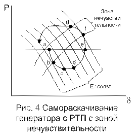 Допуская, что исходному режиму соответствует точка а. При небольшом возмущении, вызывающем увеличение угла, уменьшается напряжение на шинах генератора. Но регулятор не работает до тех пор, пока отклонение угла лежит в зоне нечувствительности. При увеличении угла на валу генератора возникает ускоряющий избыточный момент, вызывающий дальнейшее его увеличение. Когда траектория движения пересекает границу зоны нечувствительности (точка b), регулятор начинает работать. Увеличение тока возбуждения, а следовательно ЭДС генератора, замедляет снижение мощности, перемещая рабочую точку на характеристики мощности, соответствующие большим ЭДС (точки c, d). В точке e избыток мощности исчезает, но инерция ротора вызывает дальнейшее увеличение угла. В точке f угол становится максимальным, после чего начинает уменьшаться. После того как будет пройдена точка g, лежащая на верхней характеристике, регулятор начнет уменьшать напряжение возбудителя и кривая изменения мощности в обратном направлении. Таким образом, в силу внутренней неустойчивости возникают незатухающие колебания угла δ. Амплитуда этих колебаний зависит от ширины зоны нечувствительности регулятора, в месте с углом колеблются напряжение, мощность и ток генератора. Эти колебания затрудняют контроль за работой генератора и заставляют от его эксплуатации в подобных режимах. Обеспечить устойчивую работу генератора во всех точках, соответствующим углам δ > 900, позволяет усложнение системы регулирования возбуждения, которая должна реагировать не только на изменение напряжения, но и на скорость и даже ускорение изменения напряжения. Такие регуляторы называются регуляторами сильного действия. Регуляторы сильного действия обеспечивают постоянство напряжения на шинах генератора (без риска самораскачивания), поэтому генератор, снабженный такими регуляторами, может быть представлен в расчетах статической устойчивости напряжением на своих зажимах (UG =const) и xG =0.