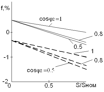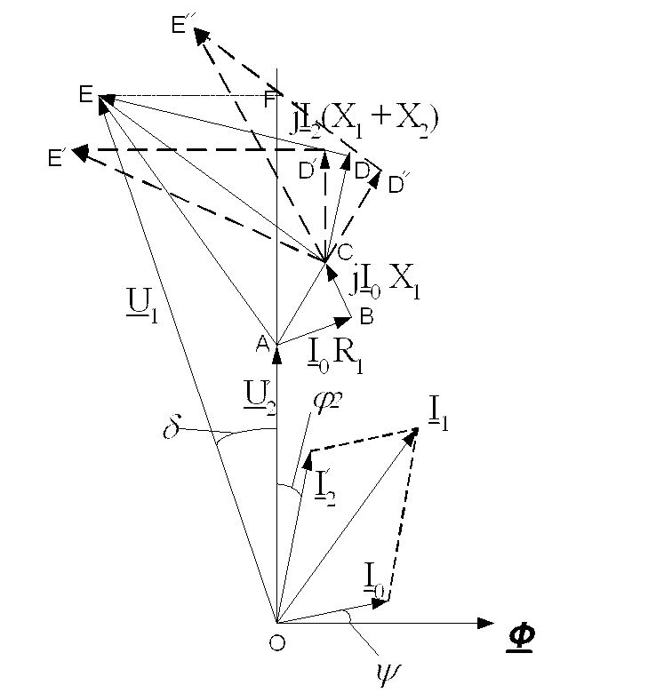 Характеристики погрешностей При n= КU погрешность в напряжении должна быть отсчитана по вертикальной оси от точки А до точки F-проекции конца вектора U 1 на эту ось. Т.к. напряжение U ¢ 2 меньше U1, погрешность отрицательна. Треугольник СDE соотв-ет номинальной нагрузке тр-ра с cosj=0, 8. При нагрузке, меньшей номинальной, стороны треугольника должны быть пропорционально уменьшены; при этом конец вектора U 1 переместится по отрезку ЕС вниз. Соответственно уменьшится погрешность. При коэф-те мощности, отличном от 0, 8, треуг-к СDE должен быть повернут вокруг точки С. Соответственно измен-ся погрешности. Характеристики представляют собой наклонные прямые, проведенные из общей точки, соответствующей погрешности при холостом ходе. Наклон харак-к определ-ся коэф-м мощности нагрузки и углом jК из выражения tgjК = (Х1 +Х¢ 2)/(R1 +R¢ 2) При коэф-те мощности, равном 1, наклон харак-ки наименьший. Наибольший наклон харак-ки имеет место при j2 = jК (рассматр-ся только индуктивная нагрузка тр-ра). Харак-ки угловой погр-ти. При холстом ходе угловая погр-ть положительна. При j2 = jК хар-ка погр-ти горизонтальна, т.е. погр-ть не зависит от нагрузки. При j2 < jК хар-ка имеет наклон вниз, при j2> jК- наклон вверх.