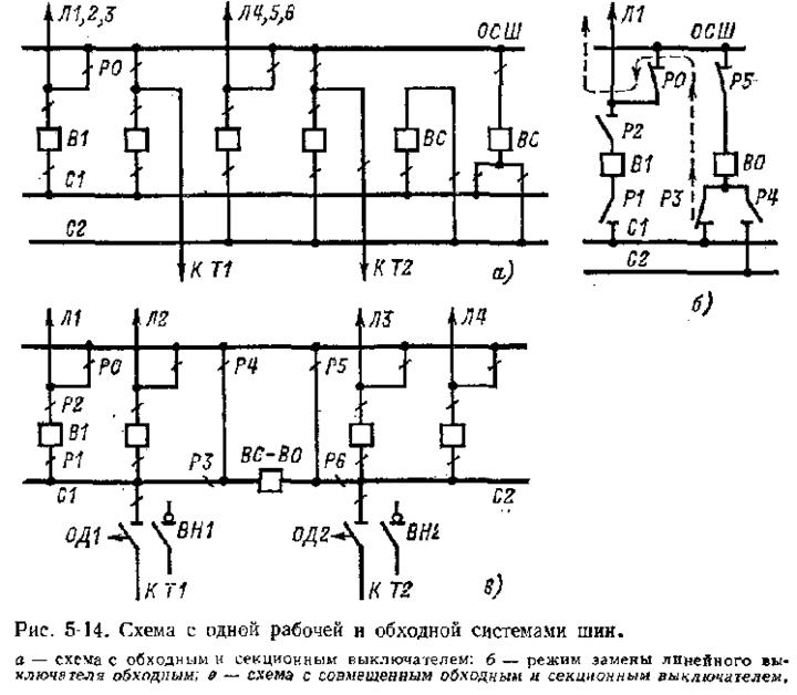 При большом количестве присоединений на повышенном напряжении возможно применение схем с одиночной секционированной системой шин (рис.. 5-8). Эта схема обладает рядом существенных недостатков, в том числе необходимостью отключения линий или источников питания на все время ремонта выключателя в их цепи. При напряжении 35 кВ отключение линии будет непродолжительным, так как длительность ремонта выключателей невелика. В этот период используется резерв по сети, чтобы обеспечить питание потребителей. При напряжениях 110 кВ и выше длительность ремонта выключателей, особенно воздушных, возрастает и становится недопустимым отключать цепь на все время ремонта, поэтому схема по рис. 5-8 применяется обычно для РУ 35 кВ. Одним изважных требований к схемам на стороне высшего напряжения является создание условий для ревизий и опробований выключателей без перерыва работы. Этим требованиям отвечает схема с обходной системой шин (рис. 5-14). В нормальном режиме обходная система шин OCIII находится без напряжения, разъединители РО, соединяющие линии и трансформаторы с ОСШ отключены. В схеме предусматривается обходной выключатель ВО, который может быть присоединен к любой секции с помощью развилки из двух разъединителей. Секции в этом случае расположены параллельно друг другу. Выключатель ВО может заменить любой другой выключатель, для чего надо произвести следующие операции: включить обходной выключатель ВО для проверки исправности ОСШ, отключить