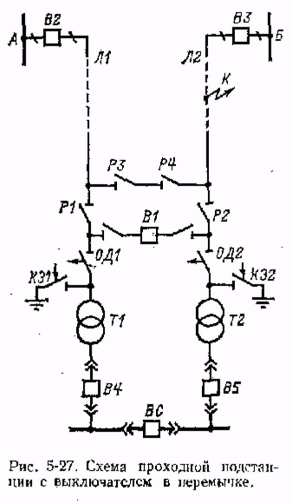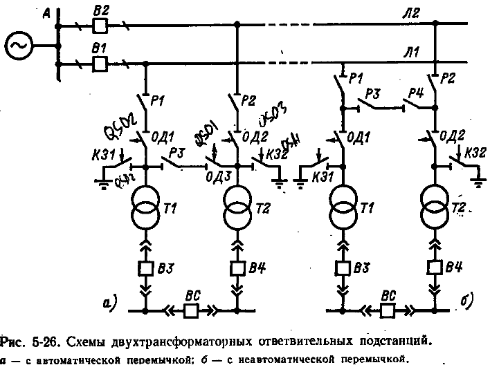 Тупиковые и ответвителные подстанции выполняются по упрощенным схемам без выключателей высокого напряжения. Однотрансформаторная подстанция может присоединяться к питающей сети но схеме блок трансформатор — линия с установкой КЗ и ОД или передачей телеотключающого импульса на опорную подстанцию (см. рис. 5-11, б). Подстанции 35- 110 кВ с двухобмоточными трансформаторами небольшой мощности (до 6300 кВА) могут иметь на стороне ВН только предохранитель и разъединитель. В этом случае необходимо проверить селективность работы предохранителей к релейной защиты линий. Двухтрансформаторные подстанции в отличие от схемы (рис. 5-11, б) снабжаются автоматической или неавтоматической перемычкой на стороне высшего напряжения (рис. 5-26). В автоматической перемычке (рис. 5-26, а) установлен разъединитель и отделитель двустороннего действия. Нормально РЗ включен, а ОДЗ отключен, так как режим работы двух линий на один трансформатор череп включенную перемычку недопустим: при повреждении в одной из параллельных линий релейная защита Отключит обе линии.