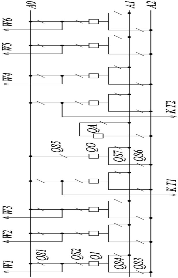 Последовательность действий при выводе в ремонт линейного выключателя Q1 (подключен к А1): 1) включить QS5 в цепи QO; 2) включить шинный разъединитель в цепи QO на ту систему шин, на которую включен выводимый в ремонт Q1, т.е. QS7; 3) с минимальными уставками релейной защиты включить QO, опробовать и если он автоматически не отключился отключить его с щита управления; 4) включить QS1; 5) с уставками Q1 включить QO. При этом образовались два параллельных пути тока. 6) отключить Q1. 7) отключить линейный QS2; 8) отключить шинный QS4; 9) заземлить выключатель. Согласно НТП: до 12 присоединений – с/ш не секционируется; от 12 до 16 – 1 секционируется и при этом в схеме два совмещенных шиносоединительных ОВ; от 16 – обе с/ш секционированы и при этом ОВ и ШСВ работают раздельно.