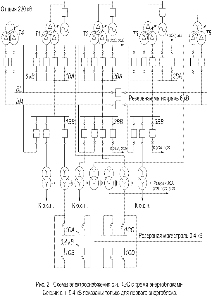 (где т.е. следует выбрать трансформатор с.н. мощностью 40 МВ·А. Если питательный насос и дутьевой вентилятор имеют турбопривод, то мощность трансформатора с.н. снижается до 32 МВ·А. Распределительное устройство с.н. выполняется с одной секционированной системой шин. На рис. 2 приведена схема питания с.н. части блочной КЭС с тремя энергоблоками по 300 МВт. Трансформаторы с.н. Т1, Т2, Т3 питают секции 6 кВ соответственно первого энергоблока 1ВА, 1ВВ, второго 2ВА, 2ВВ и третьего 3ВА, 3ВВ. К этим секциям присоединяются электродвигатели 6 кВ турбинного и котельного отделений, общестанционная нагрузка (о.с.н.) и трансформаторы 6/0, 4 кВ. Резервное питание секций с.н. осуществляется от резервных магистралей, связанных с пускорезервными трансформаторами с.н. Т4. Число резервных трансформаторов с.н. на блочных ТЭС без генераторных выключателей принимается: один – при двух блоках, два – при числе энергоблоков от трех до шести. Если в схемах энергоблоков установлены генераторные выключатели, то число резервных трансформаторов принимается по одному резервному на каждые четыре блока. При шести и более блоках предусматривается дополнительный резервный трансформатор генераторного напряжения, не присоединенный к источнику, но готовый к замене любого рабочего трансформатора с.н. Резервные трансформаторы с.н. должны присоединяться к сборным шинам повышенного напряжения, которые имеют связь с энергосистемой по линиям ВН (на случай аварийного отключения всех генераторов электростанции). Если связь осуществляется по линиям 500 – 750 кВ, то в этом случае резервные ТСН присоединяются к шинам среднего напряжения (110, 220 кВ) при условии, что они связаны через автотрансформатор с шинами ВН. Мощность каждого резервного трансформатора с.н. на блочных электростанциях без генераторных выключателей должна обеспечивать замену рабочего трансформатора одного энергоблока и одновременный пуск или аварийный останов второго энергоблока. Если неизвестно число потребителей в таком режиме, то мощность резервного трансформатора собственных нужд выбирается на ступень больше, чем рабочего. Если в схемах энергоблоков установлены генераторные выключатели, то мощность резервных трансформаторов принимается равной мощности рабочих трансформаторов. Мощность резервных трансформаторов должна быть проверена по условиям самозапуска. На рис. 2 показано питание секций с.н. 0, 4 кВ одного энергоблока, расположенных в главном корпусе. Потребители 0, 4 кВ первого энергоблока и часть общестанционной нагрузки получают питание от секций 1СА, 1СВ, 1СС, 1СD. Наиболее ответственные потребители присоединены на полусекции 1СА и 1СВ, отделяемые автоматическими выключателями от остальной части этих же секций. Резервный трансформатор 6/0, 4 кВ присоединен к секции 3ВА третьего энергоблока. Потребители 0, 4 кВ второго энергоблока присоединяются к секциям 2СА, 2СВ, 2СС, 2СD, а третьего – к секциям 3СА, 3СВ, 3СС, 3СD (на рис. 2 эти секции не показаны). Резервный трансформатор для последних секций присоединен к секции 6 кВ 2ВВ второго энергоблока. Для поддержания необходимого уровня напряжения на шинах с.н. трансформаторы имеют РПН. Схема соединения обмоток рабочих и резервных трансформаторов выбирается таким образом, чтобы возможно было их кратковременное параллельное включение в моменты перехода с рабочего на ре