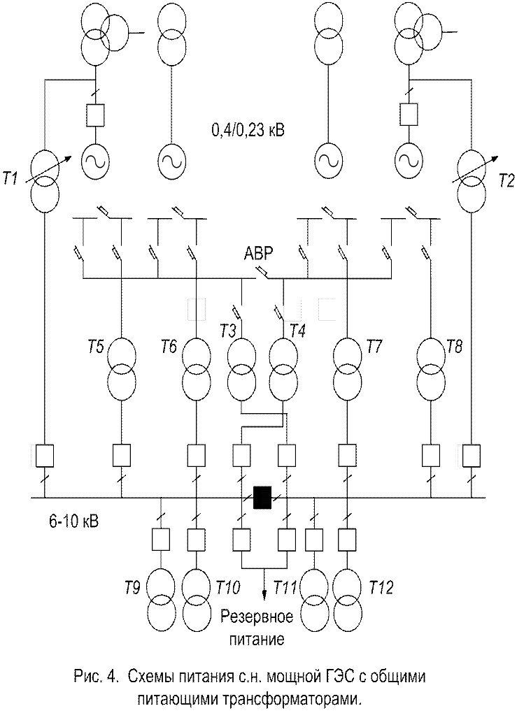 с.н. может быть значительно удалена от здания ГЭС, поэтому возникает необходимость распределения электроэнергии на более высоком напряжении (3, 6 или 10 кВ). В этом случае предусматриваются главные трансформаторы с.н. Т1, Т2 и агрегатные Т5– Т8. Трансформаторы Т9– Т12 служат для питания общестанционных нагрузок. Резервное питание секций 6 кВ осуществляется от местной подстанции, оставшейся после строительства ГЭС. Резервирование агрегатных с.н. осуществляется от резервных трансформаторов Т3, Т4. Ответственные потребители с.н., отключение которых может привести к отключению гидроагрегата или снижению его нагрузки, присоединяются к разным секциям с.н. Мощность трансформаторов агрегатных с.н. выбирается по суммарной нагрузке с.н. соответствующих агрегатов. Главные трансформаторы (Т1, Т2) выбираются с учетом взаимного резервирования и с возможностью их аварийной перегрузки.