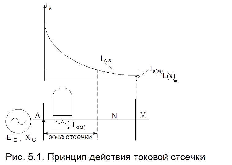 Отсечка является разновидностью токовой защиты, позволяющей обеспечить быстрое отключение к.з. Токовые отсечки подразделяются на отсечки мгновенного действия и отсечки с выдержкой времени (около 0, 3—0, 6 с). Селективность действия токовых отсечек достигается ограничением их зоны работы так, чтобы отсечка не действовала при к.з, на смежных участках сети, защита которых имеет выдержку времени, равную или больше, чем отсечка. Для этого ток срабатывания отсечки должен быть больше максимального тока к.з., проходящего через защиту при повреждении в конце участка, за пределами которого отсечка не должна работать (точка М участка AM на рис. 5-1). Такой способ ограничения зоны действия основан на том, что ток к.з. Iк зависит от величины сопротивления до места повреждения (рис. 5-1). Действительно, ток к.з. в какой-либо точке рассматриваемого участка линии:
