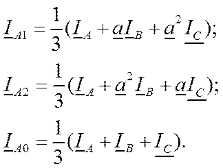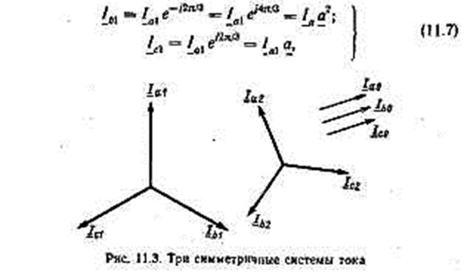 В соответствии с методом симметричных составляющих с учетом (11.7) и (11.8) трехфазную несимметричную, систему токов 1 в выражении (11.1) можно представить в виде суммы трех симметричных величин: