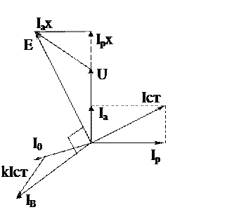 Магнитный поток х.х. создается током возбуждения Io. Магнитный поток, компенсирующий реакцию якоря, соответствует составляющей тока возбуждения kI ст. Рез-ий магн-ый поток соотв-ет полному току возб-ия Iв. Х-индуктивность рассеяния генератора.