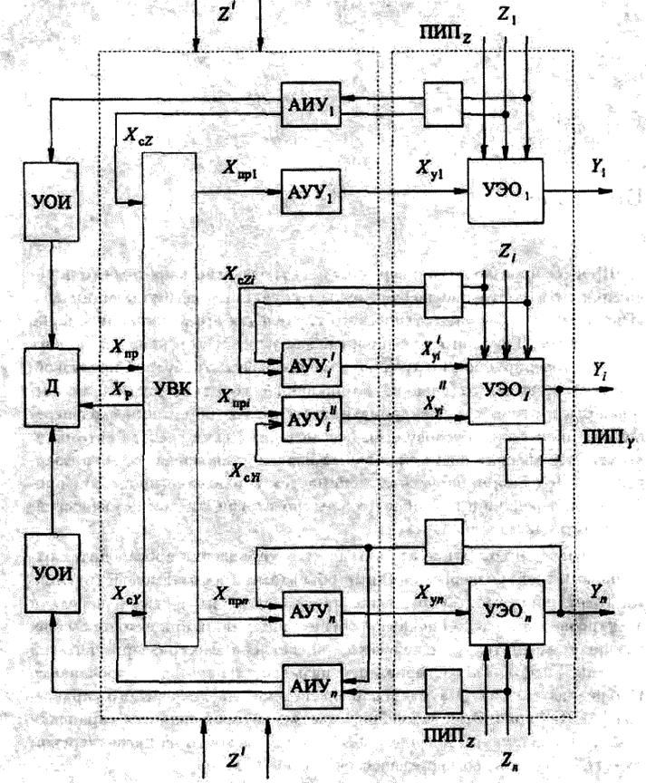 Рис. – Схема автоматизир-го дисп-го упр-я процессом произв-ва эл.энергии. Информация в виде различных электрических сигналов поставляется автоматическими информационными устройствами АИУ по каналам высокочастотной связи с ее источниками: первичными измерительными преобразователями (ПИП) режимных параметров ПИП у управляемых электроэнергетических объектов и возмущающих воздействий ПИПz. На диспетчерском пункте информация вводится в цифровые ЭВМ управляющего вычислительного комплекса и отображается для восприятия человеком. На устройства отображения УОИ поступают (постоянно или по вызову) результаты обработки информации УВК в виде рекомендаций Xр для действий диспетчера Д. В соответствии с программой Хпр функционирования УВК, задаваемой человеком, управляющие ЭВМ вырабатывают программные задания Xnp1- Хпрп действия автоматических управляющих устройств АУУ1-АУУп, установленных на управляемых электроэнергетических объектах УЭО1-УЭОп и непосредственно оказывающих на них управляющие воздействия Ху1-Хyn. Большинство автоматических управляющих устройств также используют сигналы от источников информации Управляющий вычислительный комплекс УВК с устройствами его информационного обеспечения АИУ и автоматические управляющие устройства АУУ образуют автоматическую управляющую систему. В зависимости от видов используемой информации: известной заранее — априорной или получаемой в реальном времени функционирования ЭЭС — рабочей информации автоматическое управляющее устройство АУУ совместно с управляемым электроэнергетическим объектом УЭО образует автоматическую систему с разомкнутой (рис. В.2, а и 6), замкнутой (рис. В.2, б) или комбинированной (рис. В.2.г) цепями воздействия. По разомкнутой схеме работают программные автоматические устройства (рис. В.2, а) и функционирующие только по возмущающим воздействиям Z (прямая связь ПС на рис. В.2, б), а по замкнутой — автоматические устройства, использующие рабочую информацию (по цепи обратной связи ОС) о режимных параметрах Y (рис. В.2, е) электроэнергетического управляемого объекта. Последующее восстановление связи между разделенными частями электроэнергетической системы производится автоматикой повторного включения с синхронизацией (ЛПВС). Как указывалось, информационное обеспечение АСДУ производится комплексом автоматических информационных устройств АИУi (см. рис. В.1), формирующих и передающих сигналы в цифровом виде по высокочастотным каналам связи, организуемым по проводам линий электропередачи. Информация о режимных параметрах и об изменениях схемы ЭЭС передается автоматическими устройствами телеизмерения (УТИ) и телесигнализации (УТС). Малая инерционность передачи сигналов информации о противоаварийных управляющих воздействиях и пуска исполнительных элементов запоминания их дозировки и реализации обеспечивается быстродействующими устройствами передачи сигналов противоаварийной автоматики (БСПА).