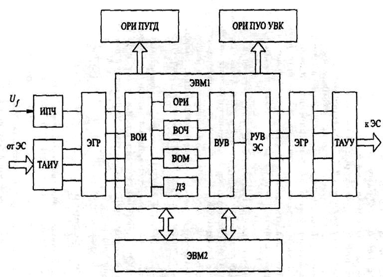 Автоматическое регулирование частоты и управление активной мощностью является главной задачей автоматизированного диспетчерского управления режимами работы ЭЭС, ОЭС и ЕЭС. Соответствующие автоматические устройства образуют централизованную автоматическую систему регулирования частотой и мощностью (ЦАРЧМ), функционирующую по ступенчато-иерархическому принципу. Нижним ее уровнем являются АСУ ТП гидро-, тепловых и атомных электростанций. Второй уровень образуют автоматические устройства, установленные на диспетчерских пунктах ЭЭС. В соответствии с расчетами по прогнозированию графика нагрузки и его оптимальному по технико-экономическим показателям выполнению УВК, используя технические средства передачи информации, выдают почасовые графики нагрузок - задания плановой мощности и определяют участие частоторегулирующих электростанций в покрытии изменений внеплановой мощности ЭЭС. Накопленный опыт эксплуатации аналоговой ЦАРЧМ способствовал разработке и внедрению цифровой автоматической системы регулирования частоты и мощности в ЕЭС с расширенными функциями и новыми свойствами: • способностью приспосабливаться (свойством адаптации) к изменениям режимов работы и складывающейся ситуации в ОЭС и ЕЭС; • обеспечением технически рационального совместного использования гидравлических и тепловых электростанций в общем процессе производства и передачи электроэнергии; • реализацией сложных взаимосвязей при анализе текущих режимов, выявлением их нарушений и определения оптимальных управляющих воздействий; • повышением работоспособности управляющего комплекса в целом и предотвращением неправильных его действий при неисправностях отдельных элементов; • • обеспечением диспетчера информацией, достаточной для оценки текущего режима и контроля за его изменениями при действии ЦАРЧМ. Высокие требования к надежности функционирования ЦАРЧМ обусловили ее осуществление на двух комплектах цифровых ЭВМ, взаимно контролируемых и резервируемых. Для наиболее полного использования ресурсов ЭВМ принято несимметричное математическое обеспечение: первая ЭВМ1 — ведущая, а вторая ЭВМ2, резервирующая ее, — ведомая. Первая производит вычислительную обработку информации ВОИ, поступающей от телеавтоматических информационных устройств ТАИУ, и выполняет все расчеты по автоматическому управлению (по программам вычислений интегральных отклонений частоты ВОЧ и мощности ВОМ, программам вычислений управляющих воздействий ВУВ и их распределения по электростанциям РУВ ЭС). Вторая дублирует расчеты первой, выполняет вспомогательные операции и выдает оперативную (рабочую) информацию для ее отображения и регистрации ОРИ на пульт управления оператора ПУО управляющего вычислительного комплекса УВК и пульт управления главного диспетчера ПУГД. Исполнение результатов расчетов разрешается только при их идентичности на выходах обеих исправных ЭВМ. Взаимный контроль ЭВМ производится периодическим обменом сигналами, подтверждающими их работоспособность. При отказе одной из ЭВМ ее функции выполняет другая — автоматическая система переходит в одномашинный режим работы, в котором производится специальный контроль, выявляющий отказы, остановы или ложную работу и запрещающий передачу регулирующих воздействий на электрост