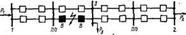 Связанная схема предусматривает объединение параллельных цепей на промежуточных подстанциях, предназначенных для связи с промежуточными энергосистемами. По дальней передаче со связанной схемой можно передавать не только мощность Р2в приемную энергосистему в конце передачи, но и мощность Р3 в промежуточную энергосистему с шин подстанции 3. Промежуточные подстанции делят линию электропередачи на участки, что способствует увеличению пропускной способности электропередачи, так как при повреждении участка отключается только цепь этого участка, а не вся линия. Кроме того, присоединение промежуточных энергосистем в определенной мере стабилизирует напряжение на подстанции, что также является косвенной мерой увеличения передаваемой по линии мощности. Если на начальном этапе сооружения электропередачи не предполагается строительство промежуточных подстанций, то тогда на линии предусматривают переключательные пункты ПП. Промежуточные подстанции или переключательные пункты делят длинную линию на короткие участки. Допустим, что сопротивление одной цепи линии равно хЛ и длины всех участков одинаковы.