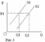 Тенденция к увеличению производства при высоких ценах объясняется тем, что с одной стороны, повышение цены привле- кает в данную отрасль новых производителей, с другой стороны, при росте цен предприниматель получает добавленную прибыль и имеет возможность нанять больше рабочих, купить больше сырья и машин, расширить производство. Вместе с тем, следует иметь ввиду, что речь идет лишь о тенденции к увеличению предложения. До известного предела рост цен вызывает рост предложения. Однако, если рост цен продолжается, то производитель может снизить объем производства. Это объясняется, с одной стороны, тем что высокий уровень дохода в известной мере снижает стимулы к продолжению интенсивной работы. С другой стороны, производитель может опасаться, что при дальнейшем наращивании объемов производства произойдет затоваривание и цены начнут снижаться. Главный фактор, воздействующий на предложение – издержки производства. Поэтому если в результате использования достижений технического прогресса или применительно к сельскому хозяйству, в силу благоприятных погодных условий удастся снизить издержки производства, кривая предложения S1 смещается вправо вниз (рис. 3).