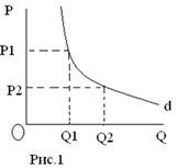 .(Рынок, несмотря на его кажущуюся стихийность и анархичность, обладает внутренним порядком, подчиняется определенным закономерностям, способен в значительной степени самонастраиваться и эффективно функционировать. Т.е. существует по выражению А.Смита, какая-то «невидимая рука», которая руководит поведением субъектов рынка, придавая им целеустремленность и направляя их в конечном счете не только на удовлетворение личных, но и общественных потребностей. Механизм функционирования рынка – это процесс формирования цен и распределения ресурсов, взаимодействия субъектов рынка по поводу установления цен, объема производства и его структуры. Основными элементами рыночного механизма являются спрос, предложение, цена и конкуренция. Спрос – это форма выражения потребности, представленной на рынке и обеспеченной соответствующими денежными средствами. Объем спроса, или количество товаров, на которое предъявлен спрос, определяется множеством факторов. Одним из важнейших факторов, определяющих величину спроса является цена товара или услуги. На рынке продавцы и покупатели преследуют свои цели: первые стремятся продать товар подороже, вторые - купить его подешевле. Покупатели предлагают за товар так называемую цену спроса, или максимальную цену, за которую они готовы купить единицу товара в данный момент. Между ценой спроса и количеством покупаемых единиц товара существует определенная взаимосвязь. Во-первых, чем меньшее количество товара предложено для продажи, тем выше покупатель оценивает его полезность, а следовательно, тем большую цену он готов за него заплатить и наоборот. Во-вторых, с повышением цены спроса сужается круг покупателей, готовых приобрести данный товар. По мере снижения цены спроса круг потребителей расширяется. Отсюда следует вывод: при прочих равных условиях снижение цены единицы товара ведет к соответствующему возрастанию величины спроса, т.е. существует обратная связь между ценой и величиной спроса. В этом суть закона спроса. Закон спроса выражает: - обратную зависимость между ценой и покупаемым количеством товаров. - постепенное убывание спроса на данный товар или услугу. Согласно закону спроса количество покупаемых товаров или услуг зависит от уровня их цен. Чем выше цена, тем меньшее количество товаров или услуг будет куплено потребителями. Если цена товара возрастает, то объем продаж товара, в соответствии с падением спроса снижается. И наоборот, если цена снижается, то объем продаж данного товара или услуги возрастает. Закон спроса отражает и другой важный процесс: постепенное убывание спроса. Снижение количества продаж данного товара или услуги происходит не только вследствие роста их цены, но и вследствие повышения потребительского спроса. Убывание спроса происходит потому, что каждая последующая покупка одного и того же товара или услуги приносит потребителю сравнительно меньшую пользу, выгоду, удовлетворение. Изобразим зависимость между ценой и величиной спроса графически. Если на абсциссе обозначить количество товара Q, покупаемого на рынке, а на ординате – движение цены Р, то получится следующий результат. (рис. 1) Кривую d в экономической литературе называют кривой спроса. Если при цене Р1 величина спроса составляет Q1, то при снижении цены до Р2