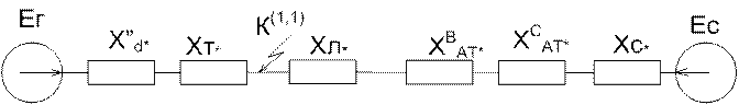 ЕГ = 1, 12; ЕС = 1. СГ: Хd*”= 0, 1. Л: ХЛЭ* = 0, 1; Х0/ХЛ1= 3. Т: Хт* = 0, 15. АТ: С: ХС* = 0, 5 Решение Составляем схему замещения прямой последовательности.