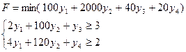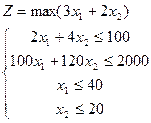Приведем пример: Изделия N1 и N2 изготовляются на фрезерных станках. Для их изготовления есть 100 кг металла. Затрата металла на изготовление одного изделия N1 составляет 2 кг, а на N2-4кг. Трудоемкость изготовления 100 и 120 станкогодин соответственно для изделий N1 и N2. Мощность фрезерных станков 2000 станкогодин на период, который рассматривается. Составить план производства, которое обеспечивает получение наибольшей выручки от продажи изделий, если отпускная цена одного изделия N1 установлена 3 грн, а изделию N2-2 грн, причем, причем изделий N1 нужно изготовить не больше 40 штук, а изделий N2-не больше 20 штук.