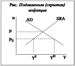 В зависимости от критериев выделяют разные виды инфляции. Если критерием служит темп (уровень) инфляции, то выделяют: умеренную инфляцию, галопирующую инфляцию, высокую инфляцию и гиперинфляцию. · Умеренная инфляция измеряется процентами в год, и ее уровень составляет 3-5% (до 10%). Этот вид инфляции считается нормальным для современной экономики и даже считается стимулом для увеличения объема выпуска. · Галопирующая инфляция также измеряемую процентами в год, но ее темп выражается двузначными числами и считается серьезной экономической проблемой для развитых стран. · Высокая инфляция измеряется процентами в месяц и может составить 200 - 300% и более процентов в год (заметим, что подсчете инфляции за год используется формула «сложного процента»), что наблюдается во многих развивающихся странах и странах с переходной экономикой. · Гиперинфляцию, измеряемую процентами в неделю и даже в день, уровень которой составляет 40-50% в месяц или более 1000% в год. Классическими примерами гиперинфляции являются ситуация в Германии в январе 1922- декабре 1924 г. когда темпы роста уровня цен составили 1012 и в Венгрии (август 1945 – июль 1946 г.), где уровень цен за год вырос в 3.8 * 1027 раз при среднемесячном росте в 198 раз. Если критерием выступают формы проявления инфляции, то различают: явную (открытую) инфляцию и подавленную (скрытую) инфляцию. · Открытая (явная) инфляция проявляется в наблюдаемом росте общего уровня цен. · Подавленная (скрытая) инфляция имеет место в случае, когда цены устанавливает государство, причем на уровне ниже, чем равновесный рыночный (устанавливаемый по соотношению спроса и предложения на товарном рынке) (рис.). Главная форма проявления скрытой инфляции – дефицит товаров.
