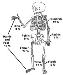 При ураженні стегнової кістки процес частіше за все розташовується в ділянці нижнього метафізу, а при ураженні голені – у верхньому метафізі, що, як звісно, відповідає законам максимального росту цих кісток в довжину. Таким чином, із всіх діафізарних кісток кінцівки частіше за все вражається кістка, яка несе найбільше функціональне навантаження, а запальний процес розвивається, як правило, біля активної росткової пластинки.