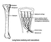 Основний фактор, який викликає розвиток інфекційного процесу в кістці, це широка петляста сітка розголуджень аа. nutriciae в ділянці метафізів та уповільнення кровотоку в системі капілярів. В розвитку остеомієліту має значення тип відходження гілок від основної кровоносної судини в кістці, тобто кут відходження. У молодих людей відмічається гострий кут відходження судини, що полегшує проникнення мікроорганізмів, у людей похилого віку кут відголудження судин прямий; крім цього, судини подовжені, звивисті та нерідко облітеровані та склерозовані.