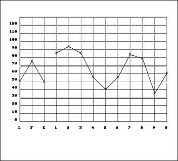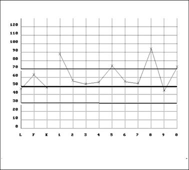 №6. Власова И.М. Пол женский. Возраст 35. Образование высшее, филологическое. Работала в библиотеке. 2 года не работает. Обследована в клинике пограничных состояний. Код 2*317”8’0-/ 95 FLK. Невроз навязчивых страхов. Стремление быть предельно откровенной. Профиль шкал достоверности в рамках допустимого разброса, однако разница между показателями F и K выявляет тенденцию к драматизации имеющихся проблем и подчеркиванию тяжести состояния. Профиль, характерный для состояния выраженной дезадаптации, сопровождающейся эмоциональной напряженностью. Резко сниженный фон настроения, падение жизненного тонуса. Навязчивые действия, чувство растерянности и паники. Сочетание эмоционально-вегетативных и физиологических расстройств. Защитные механизмы: блокировка эгоистических потребностей и активности ради сохранения бесконфликтных отношений с окружением. Реакции страха. Уход от общественной активности в мир субъективно значимых интересов. Мистический настрой, проявляющийся ирреальными опасениями. Заниженный уровень самооценки.