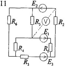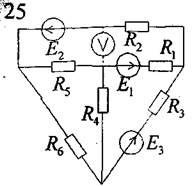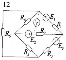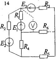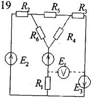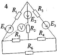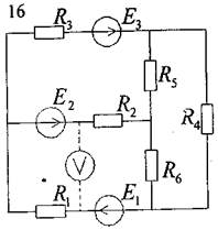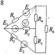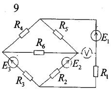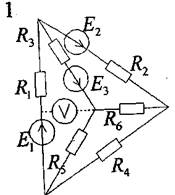 Задание 1.Составить уравнения по законам Кирхгофа. 2.Определить токи во всех ветвях цепи методом контурных токов. 3.Определить токи во всех ветвях методом узловых потенциалов. 4.Определить ток I1 (ветвь R1 схемы) методом активного двухполюсника (эквивалентного генератора). 5.Проверить баланс мощностей цепи. 6.Определить показание вольтметра. Примечание: ЭДС заданы в вольтах (В), а сопротивления - в Омах (Ом).